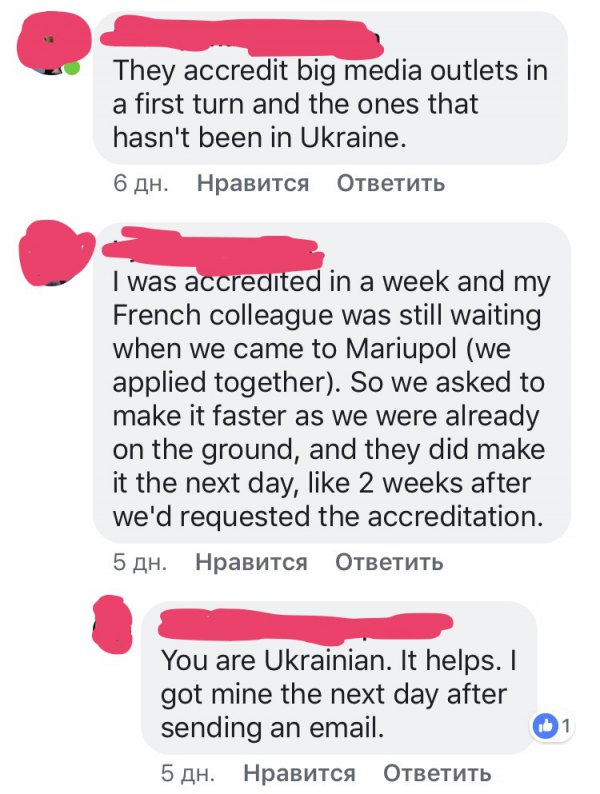 Наводжу декілька цитат від іноземних представників ЗМІ. На запитання "Як довго ви чекали, щоб отримати акредитацію в зоні проведення операції Об’єднаних сил (ООС)?" дістали такі відповіді: