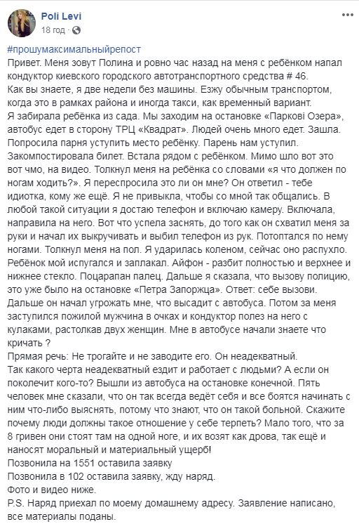 Об этом в социальных сетях сообщила пострадавшая киевлянка Полина, которая ехала в маршрутке вместе с маленьким ребенком.