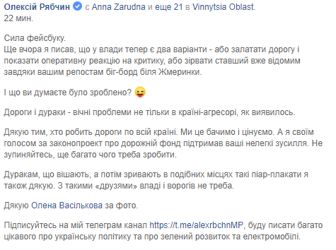 "Еще вчера я писал, что у власти теперь есть два варианта - или починить дорогу и показать оперативную реакцию на критику, или сорвать ставший уже известным благодаря вашим репост биг-борд у Жмеринки... Дуракам, что вешают, а потом срывают в подобных местах такие пиар-плакаты я также благодарю. С такими "друзьями" власти и врагов не надо", - отметил политик.