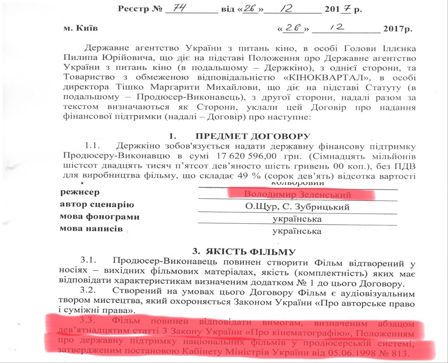 Основою для укладення такого Договору між Держкіно та ТзОВ «Кіноквартал» стало Положення про державну підтримку національних фільмів у продюсерській системі, затверджене Постановою Кабінету Міністрів України №813 від 05.06.1998 року. Все ніби згідно чинного законодавства, але дивує одне. Укладений між Держкіно і компанією Зеленського Договір містить посилання на декілька підзаконних нормативно-правових актів, а також на обов’язковість дотримання вимог Закону України «Про кінематографію», який визначає правові основи діяльності в галузі кінематографії та регулює суспільні відносини, пов’язані з виробництвом, розповсюдженням, зберіганням і демонструванням фільмів. Закон дає чітке визначення поняття «національний фільм» як створений суб’єктами кінематографії фільм, виробництво якого повністю або частково здійснено в Україні, основна (базова) версія мовної частини звукового ряду якого створена українською або кримськотатарською мовою, та який при цьому набрав необхідну кількість балів відповідно до оцінних елементів бальної системи, передбаченої цим Законом. За мотивованим рішенням Ради з державної підтримки кінематографії на підставі звернення суб’єкта кінематографії, якщо це виправдано художнім, творчим задумом авторів фільму, в основній (базовій) версії національного фільму (крім дитячих та анімаційних фільмів) допускається використання інших мов в обсязі, що не може перевищувати 10 відсотків загальної тривалості всіх реплік учасників фільму. Під час демонстрування національного фільму в Україні такі репліки мають бути дубльовані або субтитровані українською мовою.
