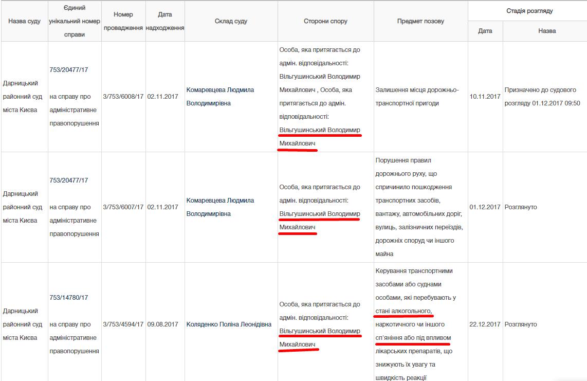 Відсутність автомобілів у власності не означає, що син судді користується громадським транспортом. У реєстрі судових рішень ми знайшли ряд рішень, які стосуються Вільгушинського Володимира Михайловича. З них дізнаємось, що особа з такими даними неодноразово притягувалась до адміністративної відповідальності за порушення ПДР, у т.ч. за керування у стані алкогольного сп’яніння. Щоправда, стосовно алкогольного сп’яніння Дарницький суд якраз дуже прихильно поставився до порушника. Вільгушинський від проходження тесту на сп’яніння відмовився і стверджував, що за кермом був не він. Справа була направлена до суду 09.08.17, але розглянута аж через 4, 5 місяці, тобто після завершення строку для притягнення до відповідальності. Суд відкинувпротокол… бо поліцейські не відібрали пояснень друзів Вільгушинського, які перебували з ним в авто. Постановою від 22 грудня 2017 року суд закрив провадження у зв’язку з відсутністю події правопорушення