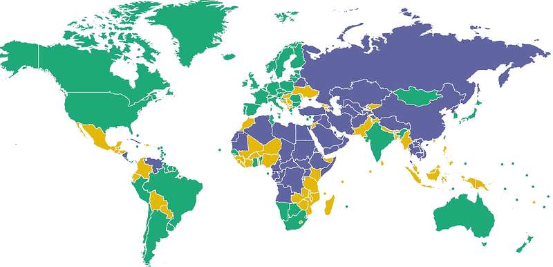 Зеленым обозначены "свободные" страны, фиолетовым - "не свободные", желтым - "частично свободные"Freedom House Ukraine