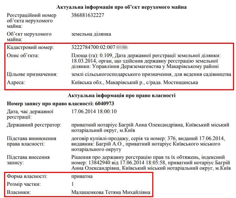 Интересно, что земельный участок в с. Первое Мая, Обуховского района она получила бесплатно, а соседние земельные участки принадлежат соучредителю ее компании Багрию К. В и его родственникам Багрий Л. А. Схемы «бесплатного» получения земли под Киевом всегда были «грязными». Очень похоже, что эти участки получены в результате именно таких схем.
