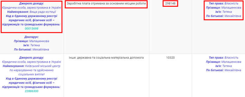 Мы проанализировали обнародованные в открытом доступе декларации Татьяны Малашенковой за 2014, 2015, 2016 и 2017 годы. Членкиня Высшего совета правосудия получает большую заработную плату. Только за 2017 год ей выплатили 2,8 млн грн и 8600 социальной помощи. Ее муж, работающий в больнице «Феофания» Госуправления делами, принес семейному бюджету 386 758 грн. Дополнительно семья продала отцу Малашенковой Михаилу автомобиль и заработала на этом 446 651 грн.