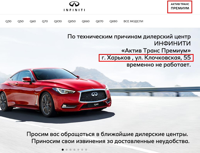 Соответствующая надпись появилась недавно на дилерском центре Инфинити “Актив Транс Премиум”, который находится по адресу Клочковская, 55 и входит в структуру Автомобильной группы “Актив”.