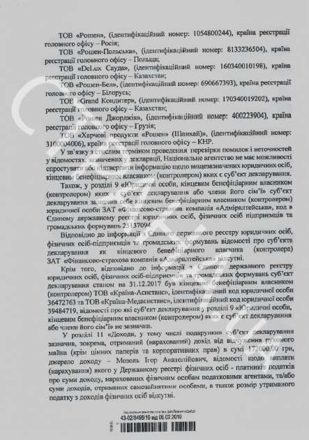 Отдельно глава государства указал ряд компаний, конечным бенефициаром которых он является (в основном это кондитерские компании, включая липецкий Рошен). Проверяющие отмечают, что в связи с коротким сроком, выделенным для проверки, они не имеют возможности подтвердить или опровергнуть, действительно ли Порошенко владеет указанными фирмами.