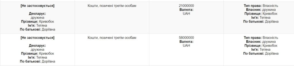 У найсвіжішій декларації за 2017 рік Кривобок повідомив, що дружина має 79 млн грн, які позичені третім особам. Кому саме невідомо, але це тільки половина від раніше вирученої суми. Куди поділася решта виручки за квартири можна тільки здогадуватися.