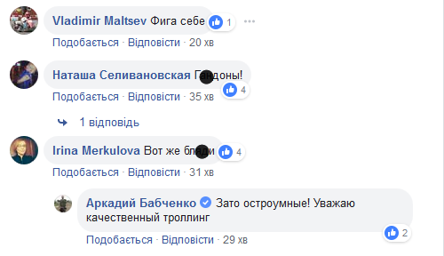 “Сработано хорошо. Залезли в мой он-лайн кабинет, поменяли настройки. Никаких СМСок мне не пришло. Ни о смене лимита оплаты в интернете, ни о списании денег. О том, что я, оказывается, ночевал в “Хилтоне”, я узнал только потому, что денег на карточке хватило только на одну ночь сибаритства (плачет), а дальше мне пришло штук двадцать отказов в транзакции – на вторую ночь роскоши уже фсе. Так что извините, чепиги *баные, вторые сутки ночевать – езжайте в свой привычный клоповник – водки больше нет. Легенду поменяли”, – заявил Бабченко.