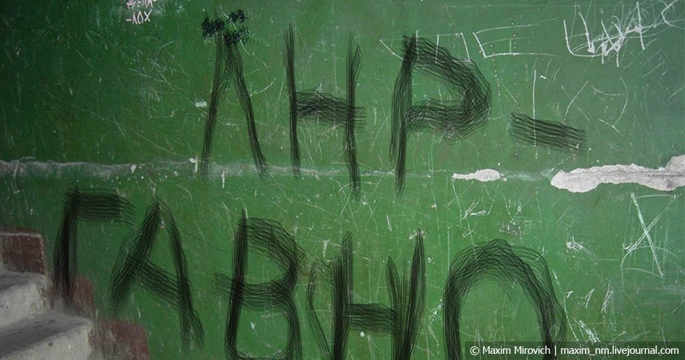 Ну и вот это тоже подъезды Луганска. Кто-то долго и старательно выводил маркером эту надпись: