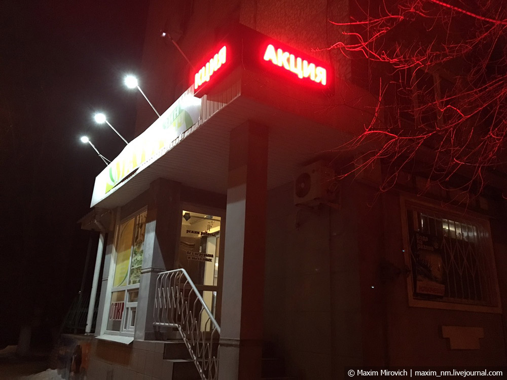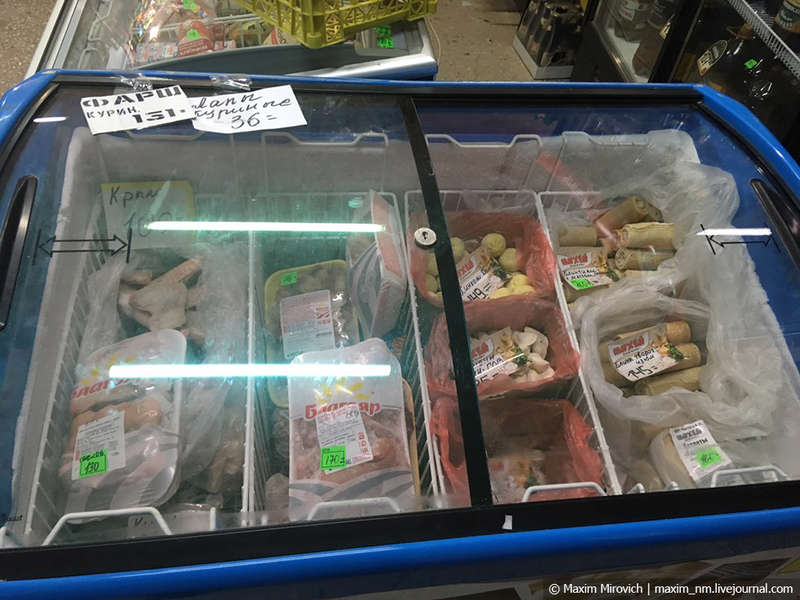 Обычный народ больше ходит вот в такие маленькие магазинчики, которые устроены в подъездах и всяких небольших помещениях. Работают магазины с 8 до 20:00 и обещают каждый день хлеб хорошего качества, а также «лапы куриные».