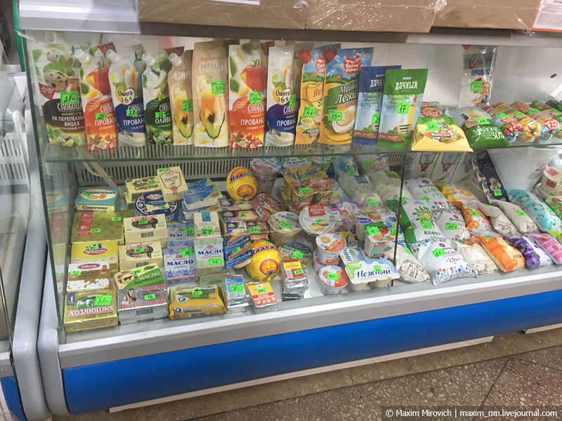 Молочный отдел. Есть молоко, масло, а также множество майонезов поз названием «лёгкий», «дачный» и «на перепелиных яйцах».