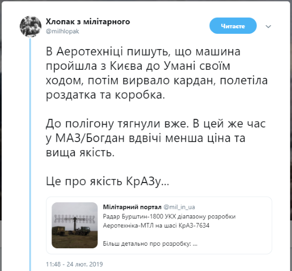 Така інформація, а також фотографії поломок з’явилися сьогодні у соціальних мережах з посиланням на представників компанії «Аеротехніка-МЛТ», чия РЛС «Бурштин-1800» й розміщена на новому шасі від ПрАТ «АвтоКрАЗ».