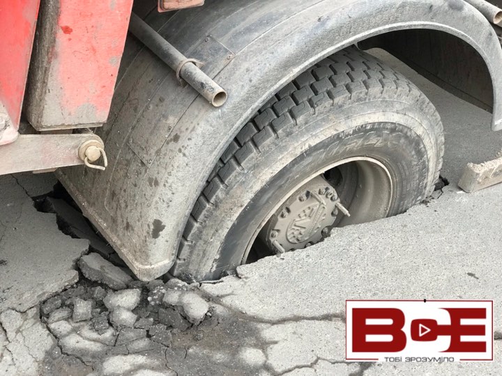 На фото видно, що провалилась одна сторона транспортного засобу.