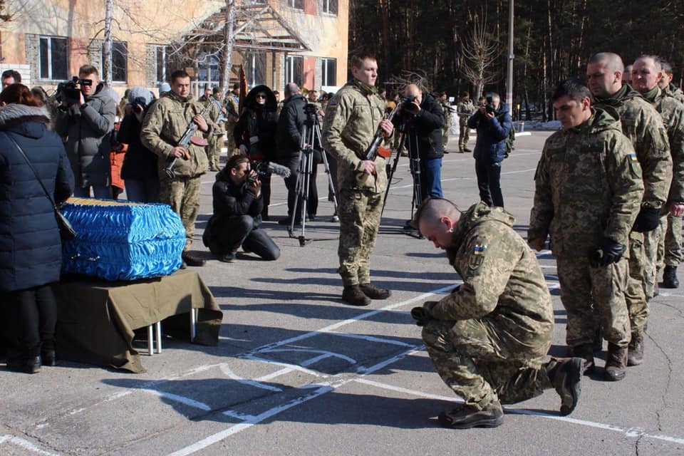 Во время прощания с Русланом бойцы создали живой коридор, по которому пронесли тело побратима. Когда гроб приближался, пришедшие попрощаться становились на колени.