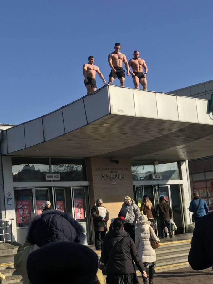 "Возле метро Дарница очень горячо. Трое мужчин с обнаженным торсом поздравляют прекрасную половину человечества с праздником", — отмечается в сообщении.