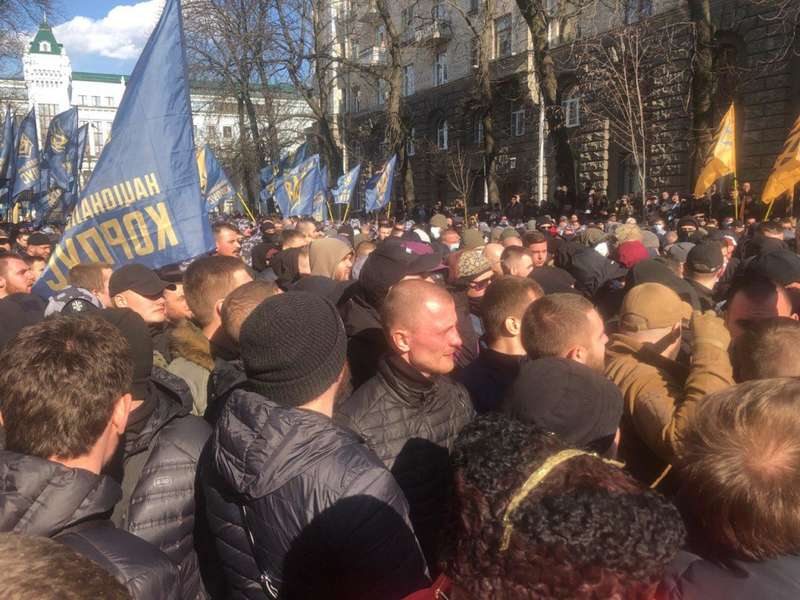 Так, сегодня начался уже второй за последние недели митинг Нацкорпуса. Также на акцию вышли "Национальные дружины".