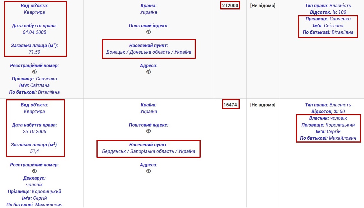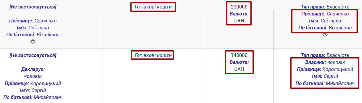 У деклараціях за 2015, 2016, 2017 та 2018 роки Світлана Віталіївна задекларувала 577 тис. грн доходів, враховуючи гроші від продажу майна. Починаючи з 2017 року, вона також вказує в декларації Сергія Михайловича Королицького як особу, з якою проживає, але не перебуває в шлюбі (у 2018 році – вже як чоловіка). У свою чергу Сергій Михайлович за ці 2 роки задекларував 63 тис. грн заробітної плати.