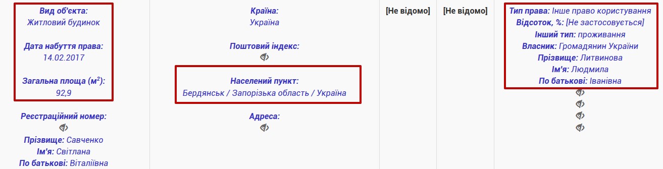 Вищезгадана матір Світлани Віталіївни Людмила Іванівна Литвинова в реєстрі речових прав на нерухоме майно значиться власницею 3 квартир, 2 земельних ділянок та 2 будинків (один з них площею 92,9 кв.м).