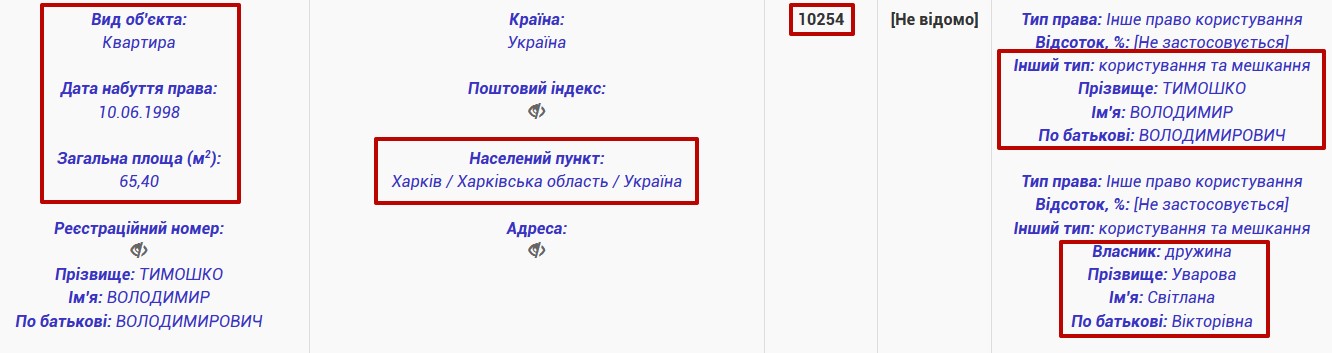 Серед майна у власності Світлани Уварової квартира площею 65,40 кв.м у Харкові. Володимир Володимирович Тимошко має лише право на користування нею.