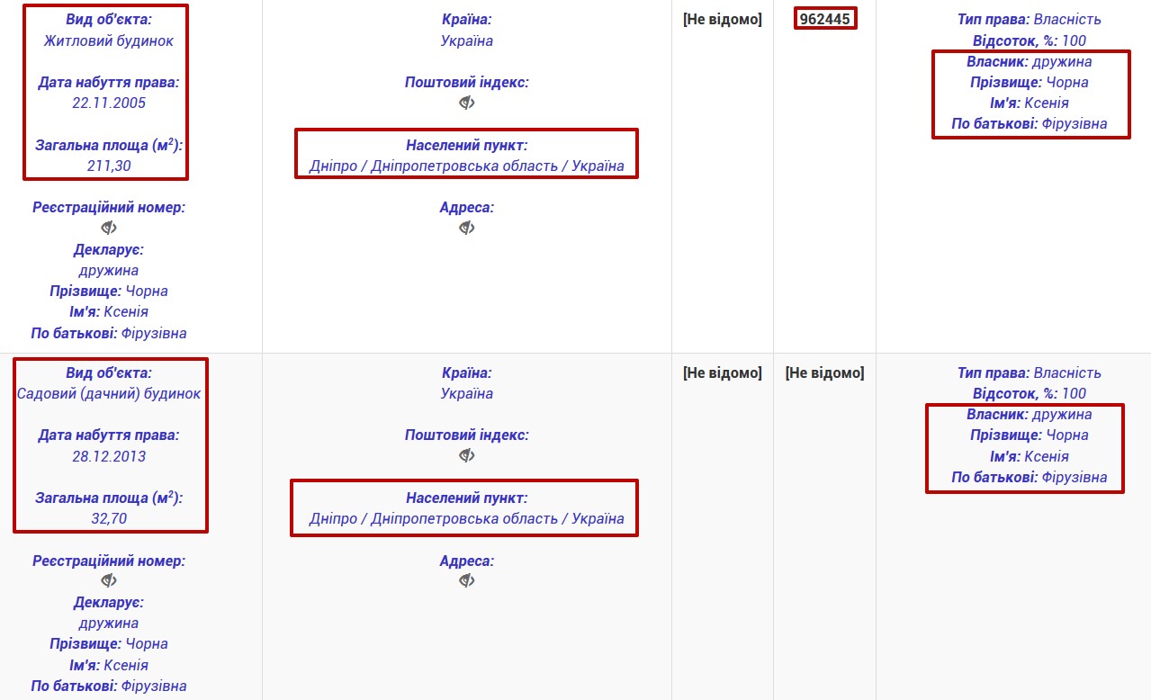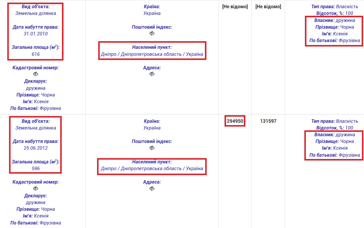 Дружина прокурора володіє житловим будинком у м. Дніпро. Його площа 211 кв.м, а задекларована вартість – 962 тис. грн. Окрім цього, Ксенія Фірузівна є власницею садового будинку (32 кв. м) та двох земельних ділянок. До речі, одну із земельних ділянок площею 596 кв.м (правовласності набуто 25.06.2012) пані Ксенія не вказує ні у декларації за 2016, ні у декларації за 2015 рік.