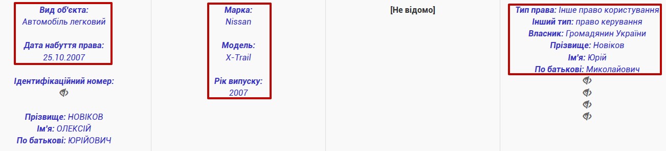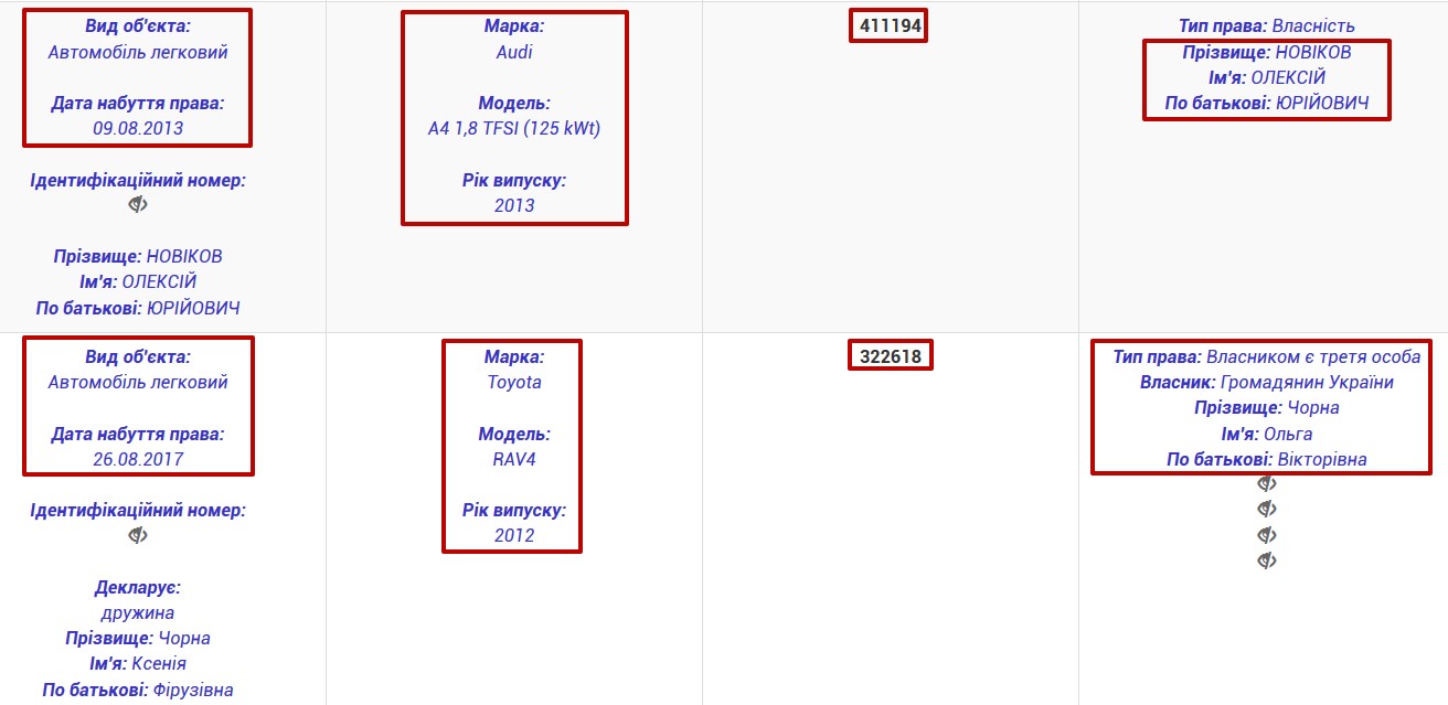 Авто в Олексія Новікова - Audi A4 1,8 TFSI (125 kWt) 2013 р.в. вартістю 411 тис. грн. Окрім цього, він користується автомобілем свого батька Nissan X-Trail 2007 р.в. Дружина прокурора користується автомобілем її матері - Toyota RAV4 2012 р.в. Вартість цього авто складає 322 тис. грн.