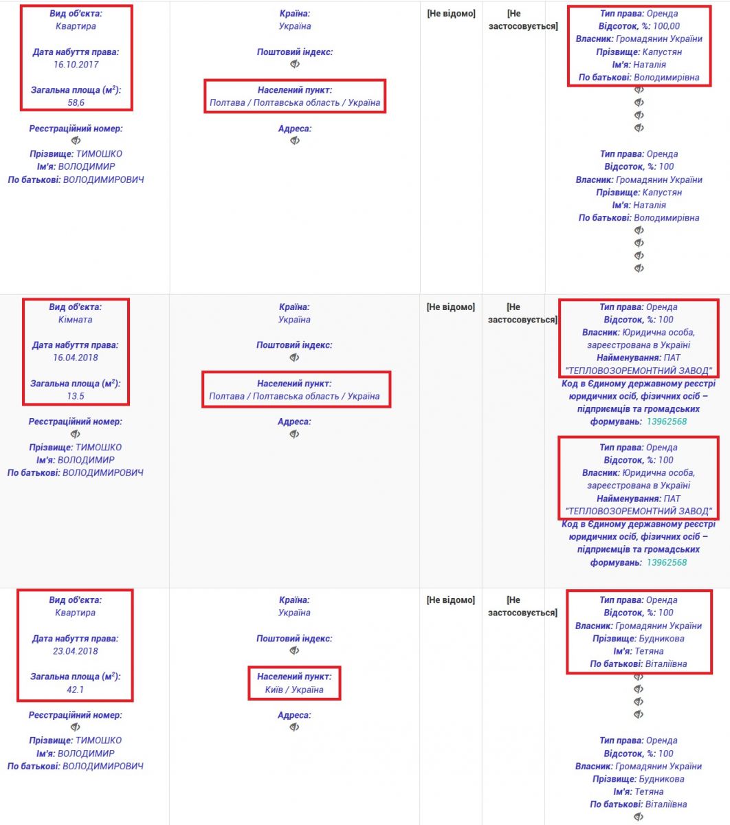 Ще три житлові об’єкти Володимир Тимошко також орендує. Мова йде про квартиру у Києві та квартиру і кімнату у Полтаві.