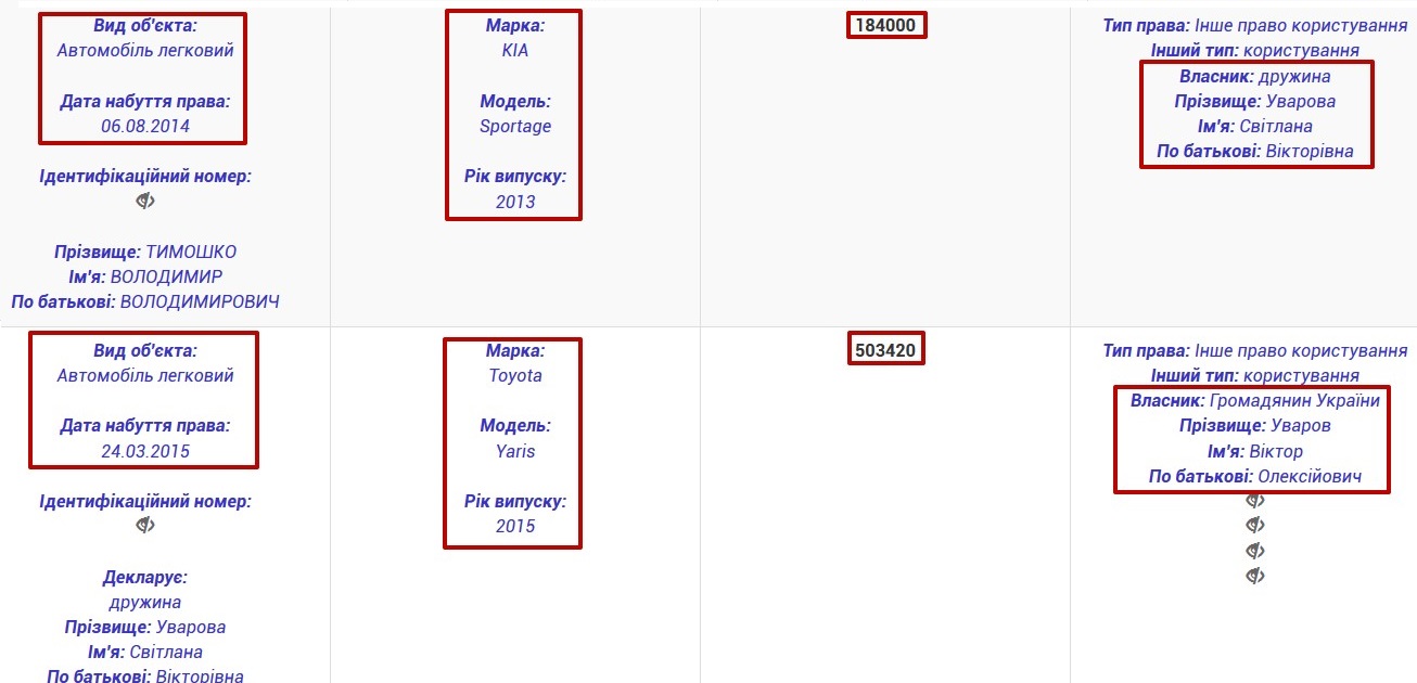 Єдиним автомобілем у родині володіє теж Світлана Уварова. Це KIA Sportage 2013 р.в., який вона придбала у 2014 році за 184 тис. грн. Цим авто користується і Володимир Тимошко. Окрім цього, пані Світлана вказала право користування автомобілем її батька - Toyota Yaris 2015 р.в. Придбав це авто Віктор Олексійович Уваров у тому ж 2015 році за 503 тис. грн.