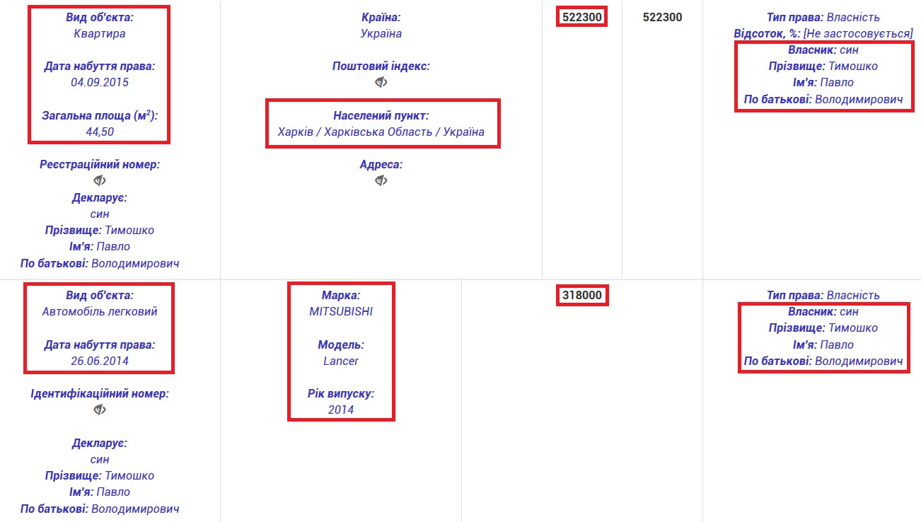 У своїх деклараціях за 2015, 2016, 2017 та 2018 роки Володимир Тимошко вказав, що заробив 760 тис. грн. Його дружина Світлана Уварова за аналогічний період вказала лише 5624 грн заробітної плати у 2015 році. Однак саме вона у тому ж році подарувала сину Павлу Володимировичу Тимошко квартиру вартістю 522 тис. грн.