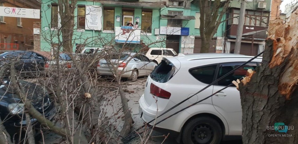 По словам очевидцев, сломанное дерево при падении повредило провода и припаркованные автомобили. В частности, ветки задели белый автомобиль Fiat и переднюю часть автомобиля Chevrolet, также повреждены автомобили Таврия и Skoda. В нескольких авто вылетели стекла.