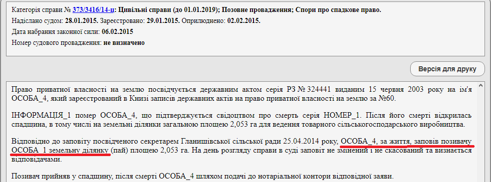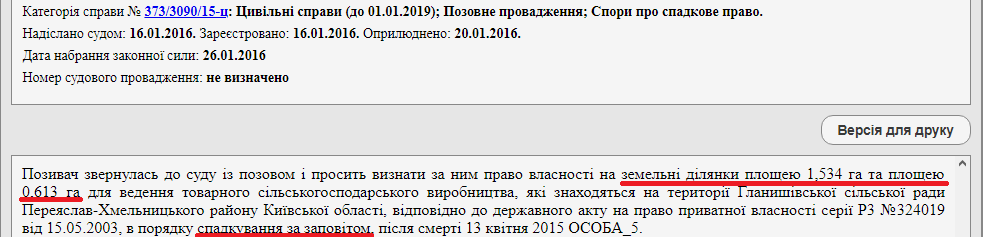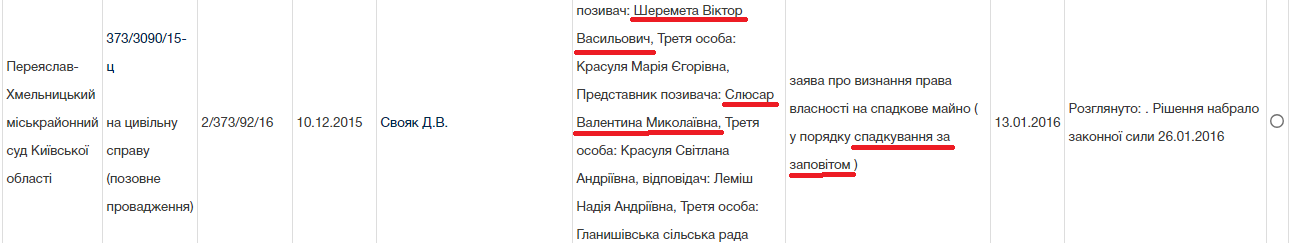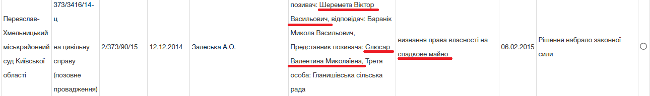 Перша справа (373/3416/14-ц) була розпочата в грудні 2014 року. Згідно з матеріалами Судового реєстру Валентина Слюсар звернулася до суду з позовом і попросила визнати за Віктором Шереметою право власності на дві земельні ділянки (загальною площею 2,053 га), що розташовані на території Гланишівської сільради й призначені для ведення сільського господарства.