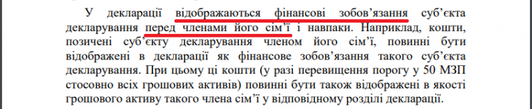 Водночас в офіційному роз’ясненні Нацагентства по боротьбі з корупцією сказано, що в деклараціях необхідно вказувати борги, які є перед родичами: «У декларації відображаються фінансові зобов’язання суб’єкта декларування перед членами його сім’ї і навпаки».