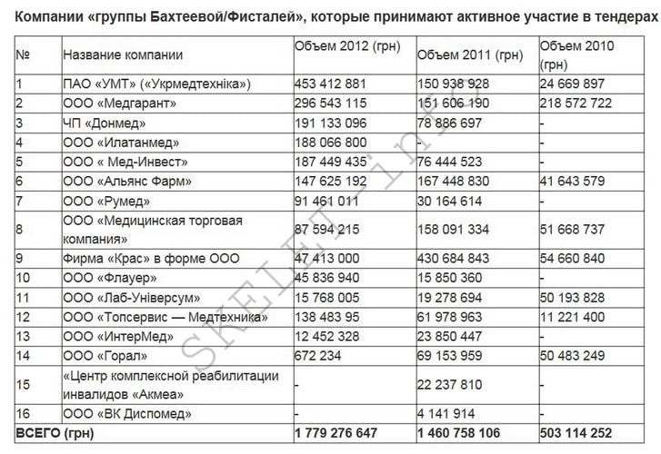Доступ к настоящим большим деньгам Фистали получили с помощью Татьяны Бахтеевой. Еще раз повторим, что когда Бахтеева в 1997-м возглавила в Донецке облздрав, то братья Фистали тут же учредили одну из своих первых фирм для «большого бизнеса» ЧП «ПКФ «Донмед». А когда Бахтеева в 2002-м избралась в нардепы и получила в свои руки парламентский комитет по здравоохранению, то через год в Киеве с фирмой «Диспомед» появились и Фистали. К сожалению, подробной информации о деятельности тандема Бахтеева-Фистали в период 2003-2010 г.г. не сохранилось, зато SKELET-info известно про тендеры периода 2010-2012 г.г., когда парламентский комитет Бахтеевой получил такое могущество, что его называли «вторым Минздравом». Именно в эти три года фирмы Фисталей, под покровительством Бахтеевой, начали регулярно выигрывать крупные тендеры, быстро выбившись в лидеры рынка: они освоили более 3,5 миллиардов гривен (440 миллионов долларов по тогдашнему курсу).