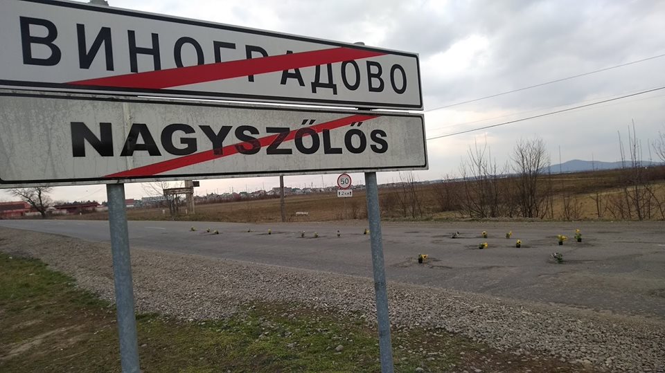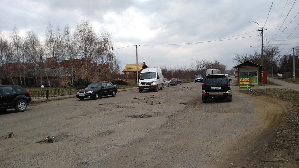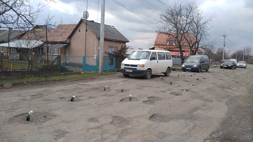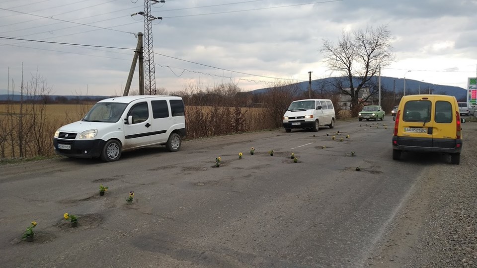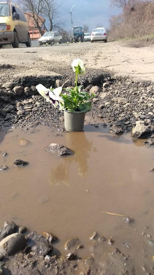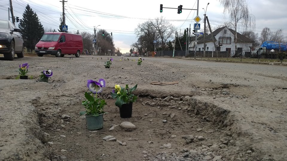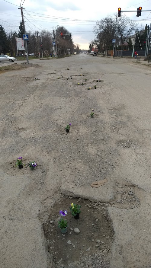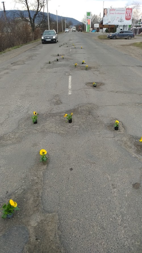 В городе Виноградове Закарпатской области по возможным маршрутам следования кортежа Порошенко в дорожных ямах установили цветы в горшочках. Так жители решили присоединиться к “областному благоустройству” Закарпатья, которое сегодня, 15 марта должен посетить Порошенко.