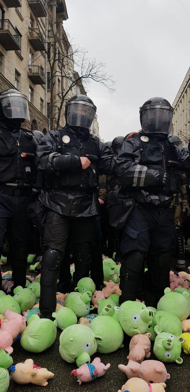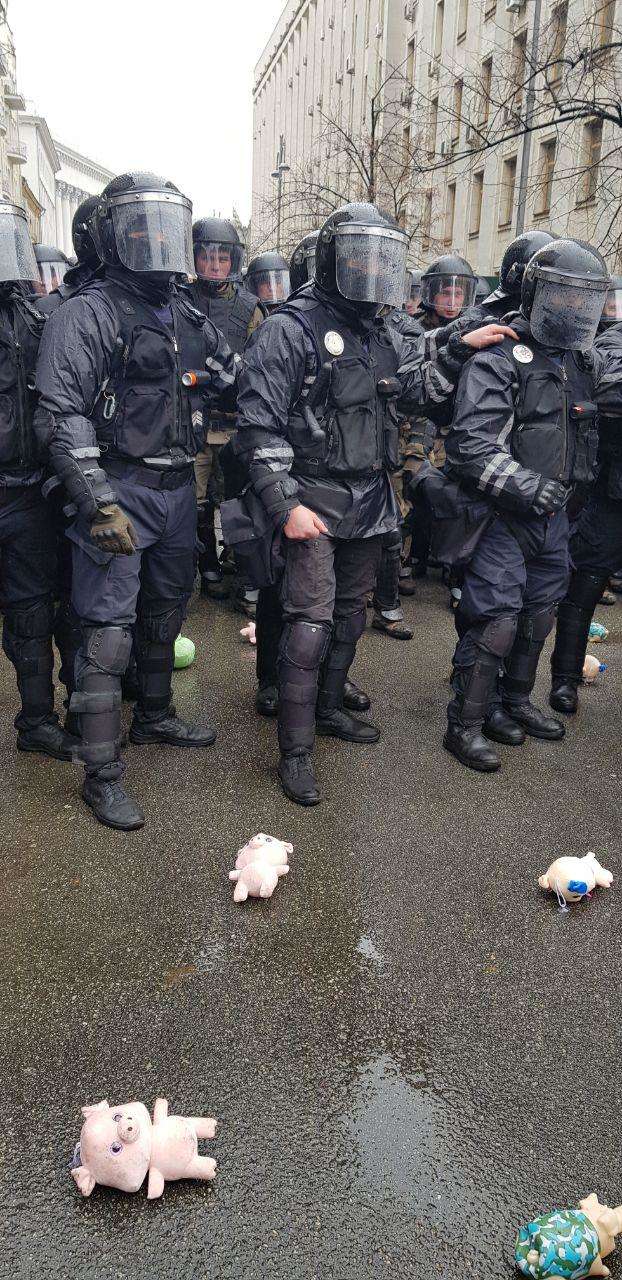 Поскольку пройти к зданию не удалось, "Нацкорпус" решил под музыку из игры Angry Birds стрелять из рогатки свинками в сторону АПУ. Соответственно, игрушки полетели в правоохранителей.