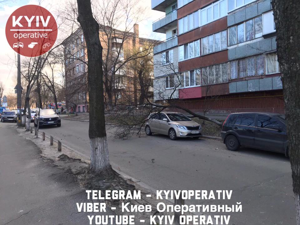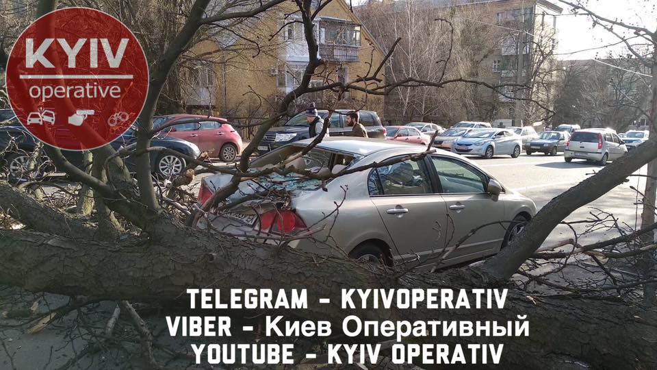 В Киеве в пятницу, 22 марта, снова поднялся шквальный ветер. На многих улицах столицы на припаркованные автомобили попадали деревья.