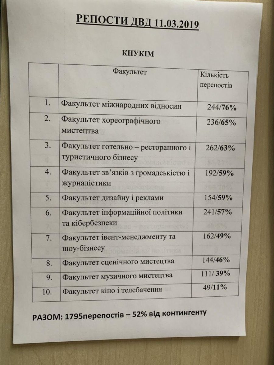 «РБК-Украина» опубликовало список, который предоставил один из студентов вуза. На нем перечислены факультеты и общее количество репостов.