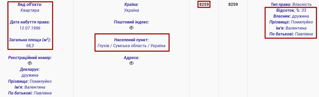 У дружини колишнього працівника міліції у власності (33%) з 1996 року перебуває квартира у тому ж Глухові.  Її площа 58 кв. м, а задекларована вартість трохи більше 8 тис. грн.