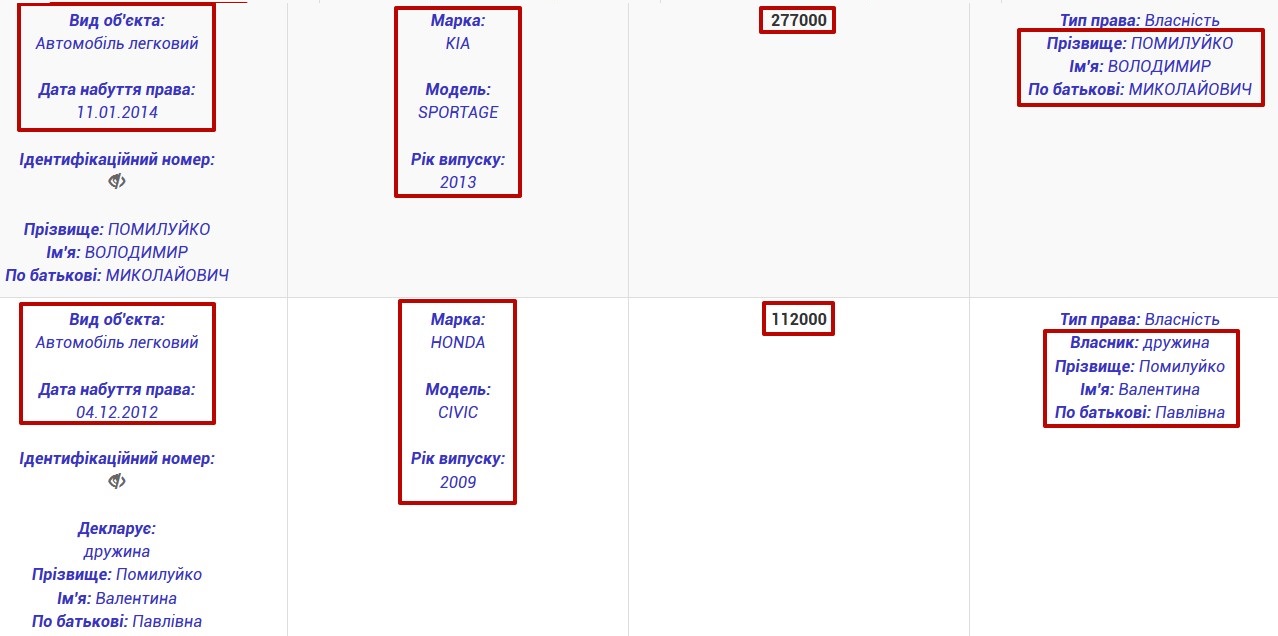 Серед рухомого майна у родини лише автомобілі. Володимир Миколайович Помилуйко з 2014 року є власником KIA SPORTAGE 2013 р. в. Обійшлося це авто Володимиру Миколайовичу у 277 тис. грн. Валентина Помилуйко володіє HONDA CIVIC 2009 р. в. та вартістю 112 тис. грн.