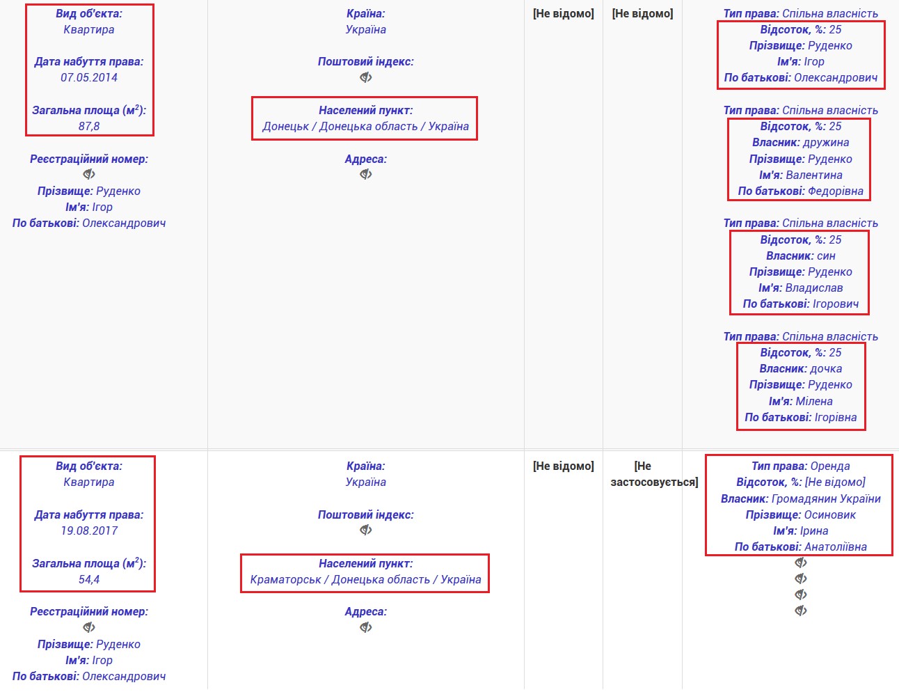 Серед нерухомого майна у власності Ігоря Руденка, його дружини та двох дітей є квартира у м. Донецьк. Її площа 87, 8 кв. м. Що цікаво, її власниками вони стали 07.05.2014 року – тобто вже після захоплення Донецька терористичним угрупуванням, так званим ДНР.  Також у своїй декларації за 2017 рік Ігор Руденко вказав право користування квартирою в Краматорську. Однак жоден із членів родини права користування цим житлом не має, що викликає питання: де проживають родичі колишнього прокурора.