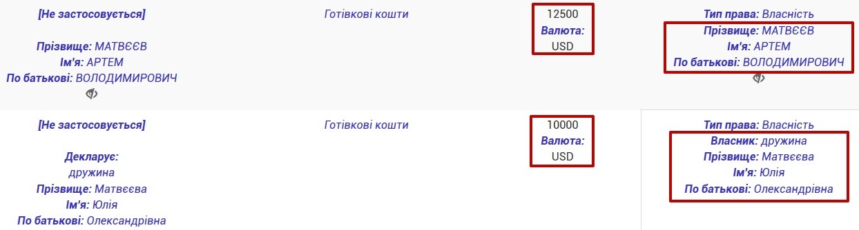 У своїх деклараціях за 201720162015 та 2014 роках Артем Матвєєв вказав 427 тис. грн. заробітку. Його дружина-суддя за аналогічний період вказала 858 тис. грн доходу. Окрім цього, подружжя задекларувало 22,5 тис. доларів заощаджень.