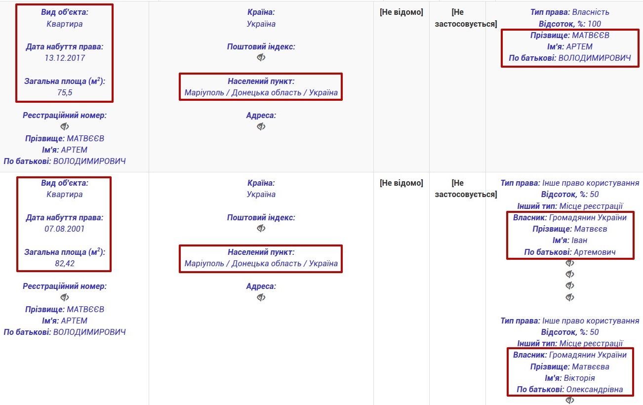 У своїй декларації за 2017 рік Артем Матвєєв зазначив, що є власником квартири у Маріуполі. Її площа 75 кв. м, а от вартості житла колишній прокурор так і не згадав. Також з 2001 року він декларує право користування квартирою своїх родичів, як місце реєстрації. Втім, цього житла Артем Матвєєв не вказував у жодній своїй декларації до 2017 року. Як наслідок – всі вони були пусті, тобто жодного нерухомого майна подружжя не вказувало, що, очевидно, не відповідало дійсності.