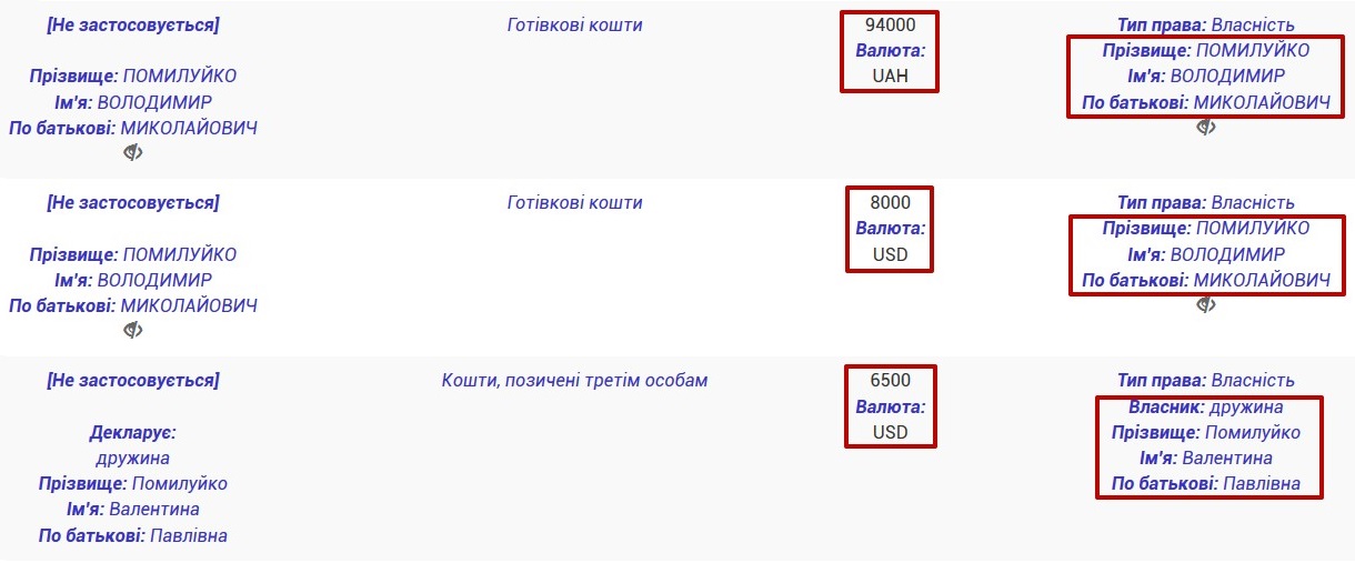 У своїх деклараціях за 201320142016 та 2017 роки Володимир Миколайович Помилуйко вказав 698 тис. грн доходу. Дружина Володимира Миколайовича – Валентина Павлівна Помилуйко за аналогічний період заробила 70 тис. грн.
