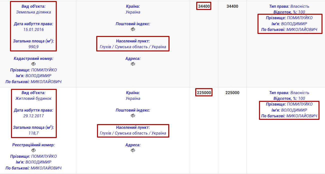 У власності Володимира Миколайовича Помилуйко є земельна ділянка та невеличкий будинок площею 118 кв. м в Глухові. Сумарна вартість цього нерухомого майна – 259 тис. грн.