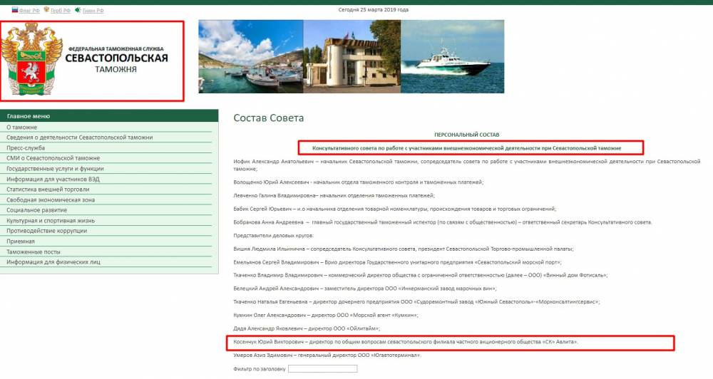 Хотя после аннексии Крымского полуострова российскими властями, Косенчук работал на должности директора по общим вопроса севастопольского филиала ЧАО «СК «Авлита» (входящую в бизнес-группу «Портинвест» олигарха Рината Ахметова, которую возглавляет Александр Смирнов – Ред.). На своей должности менеджер не возражал, чтобы его включили в… консультативный совет по работе с участниками внешнеэкономической деятельности при Севастопольской таможне РФ. Возглавлял совет начальник таможни Александр Иофик, внесенный в базу «Миротворца».