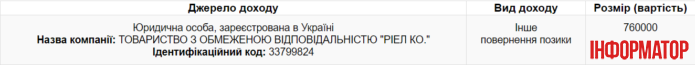 У цій саме зміні до декларації Атрошенко задекларував дохід – повернення позики ТОВ “РІЕЛ КО.” у розмірі 760 тисяч гривень, що порівняно з купівлею корпоративних прав іншого ТОВ – копійки.