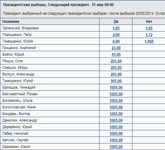 Тем временем Betfair ставит на победу Зеленского с коэффициентом 1,66. Далее идут Порошенко (2,3), Тимошенко (5,0), Бойко (10,0), Гриценко (12,0), Ляшко (21,0).