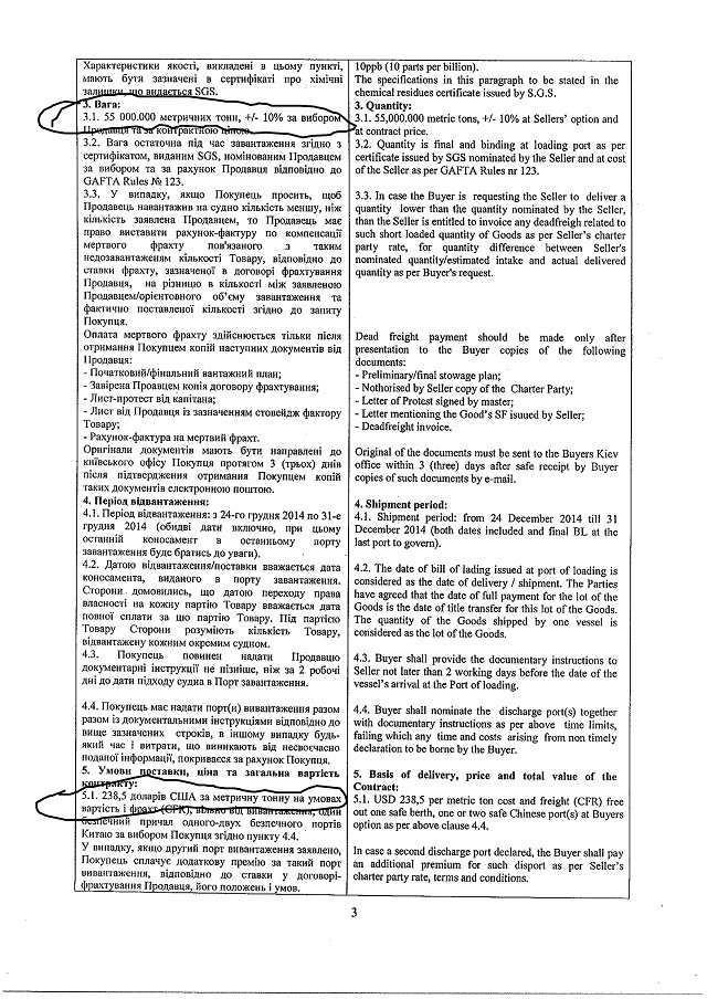 Кроме того, цена, указанная в контракте с “Noble Resources SA” на $15,5 за метрическую тонну выше цены, указанной в контракте с китайской компанией ССЕС. В результате таких соглашений с посредником, а, по сути, “профессиональных” управленческих решений Томиленко, переплата государственной корпорации, а, значит, и всего государства Украина от данной сделки составила $852,5 тыс. Требует ли уточнений, в чьих карманах осела эта сумма?
