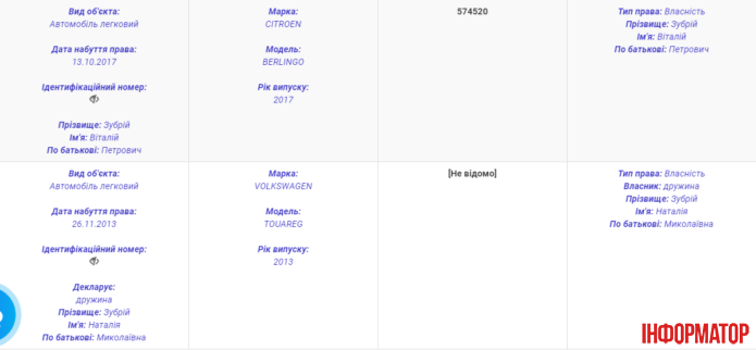 Судячи з декларації Зубрія, в нього вже є два авто.