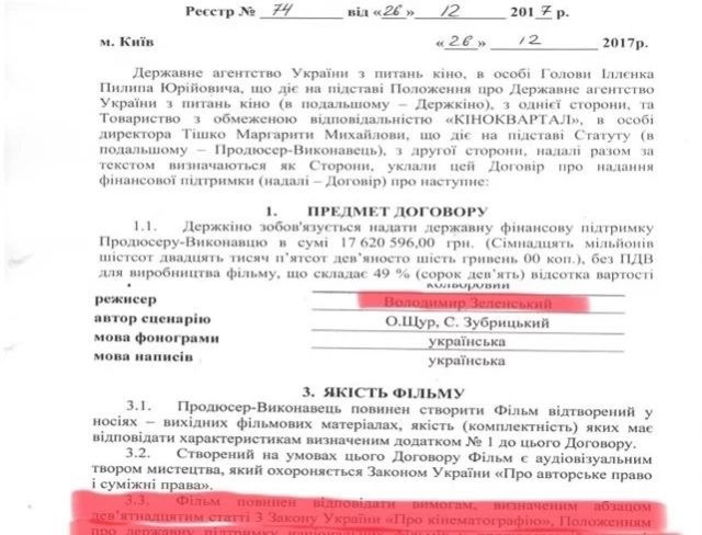 Вместе с тем, фильм кинокомпании Владимира Зеленского «Я, ты, он, она» был полностью снят на русском языке (видимо по мотивам его показа на территории страны-агрессора) и только потом ленту продублировали на украинском языке, на что было потрачено дополнительные средства. Поэтому заключение договора о предоставлении государственной финансовой поддержки такому «национальному фильму», по мнению общественных активистов, содержит признаки преступления «Присвоение, растрата имущества или завладение им путем злоупотребления служебным положением, совершенное в особо крупных размерах или организованной группой», отмечает Лисняк.