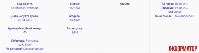 Про це стало відомо зі змін у декларації співробітника МВС. 8 квітня Росинець придбав, а 10 задекларував новеньке авто Toyota Camry 2018 року випуску.